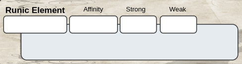 On your character sheet right below the spot for your character name you will see a place to put your Runic Element information. The fields provided are Runic Element, Affinity, Strong, Weak, and Other Information.