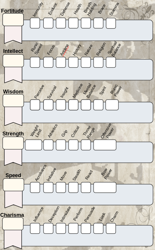 Intellect is your ability for reasoning, memory, and learning. It shows your ability to work within the magical and supernatural as well. Intellect is a main stat, one which you will place stat points into when determining your stats and throughout game play. Intellect has the following traits: Runic Speed, Focus, Arcana, History, Nature, Religion, and Spiritual Balance. When assigning stat points to Intellect, place the stat within the large Stat bubble.