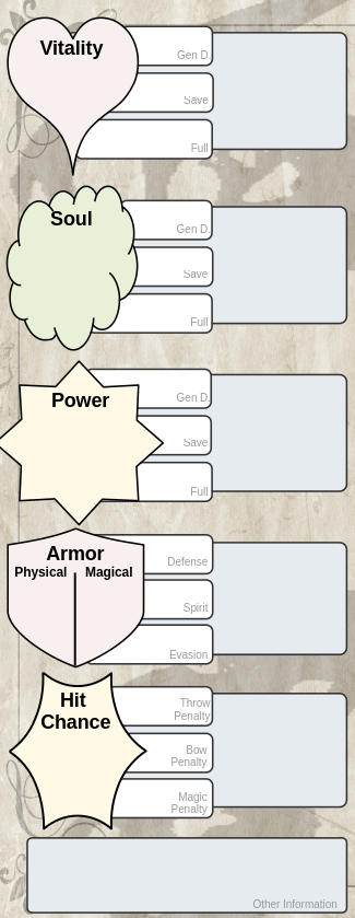 Vitals are the stats that you refer to to determine the life and energy of your character. These stats are Vitality, Soul, Power, and Hit Chance. Armor is also listed here but is covered in the armor section. You will not place any stat points into these stats but your race or element might have a modifier for these stats. These stats are directly determined by your character's main stats. Each of these stats have various other stats connected to them.