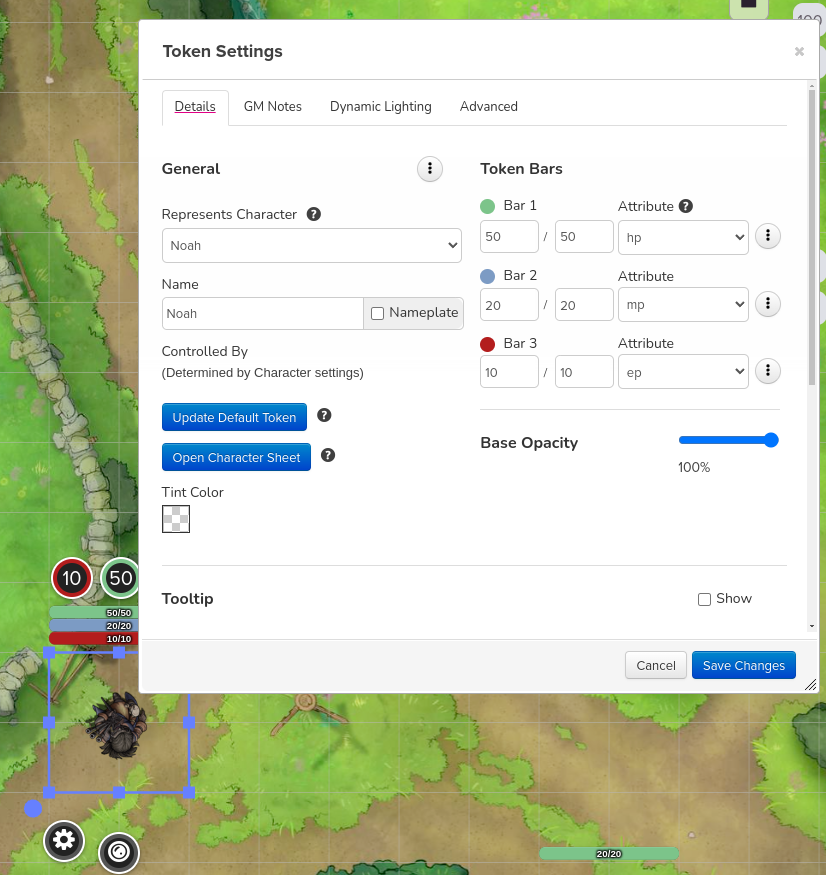 The area for Token Bars (bar 1, bar 2, bar 3) is what you want. Make sure you put in the correct current and full stat from your character sheet. Then save changes.